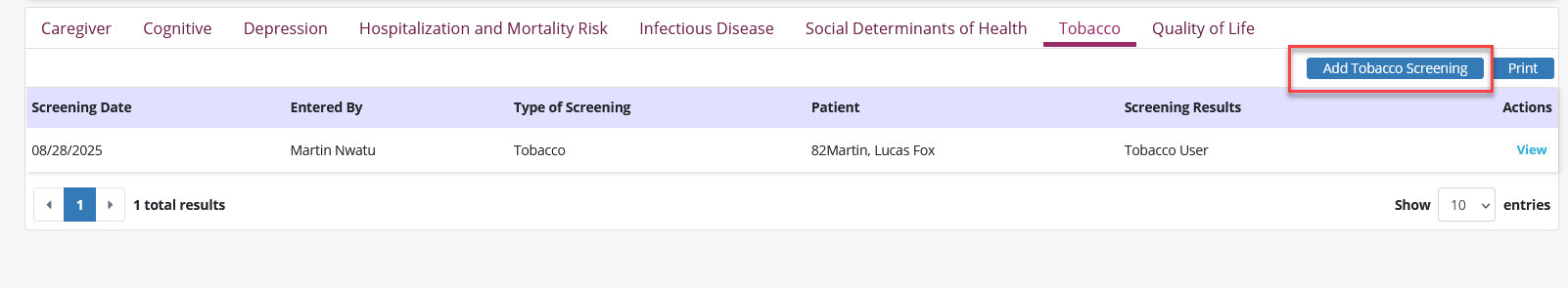 Patients tab ➜ Screenings ➜ Tobacco tab ➜ Add Tobacco Screening