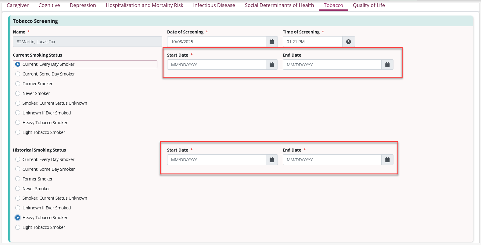 On the Tobacco Screening page, select the appropriate responses under Current Smoking Status and Historical Smoking status. The system will require start and end dates when appropriate. Once the form is saved, the results will appear in the table on the Tobacco tab.