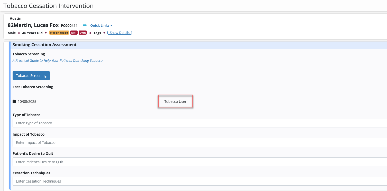 To update these fields from the patient chart, click Add Tobacco Screening to open the Tobacco Screening.
