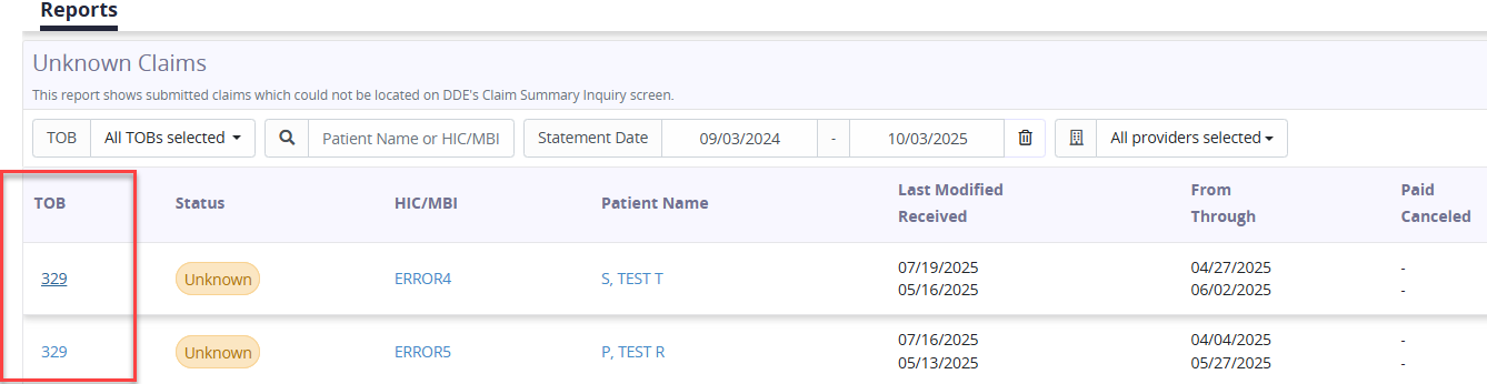 Select TOB to view the reason the claim is in the Unknown Claims section.