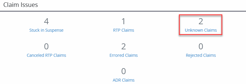 To view an unknown claim, navigate to the Claim Issues section and select Unknown Claims, or select Claim Reports under the Reports tab and click Unknown Claims.