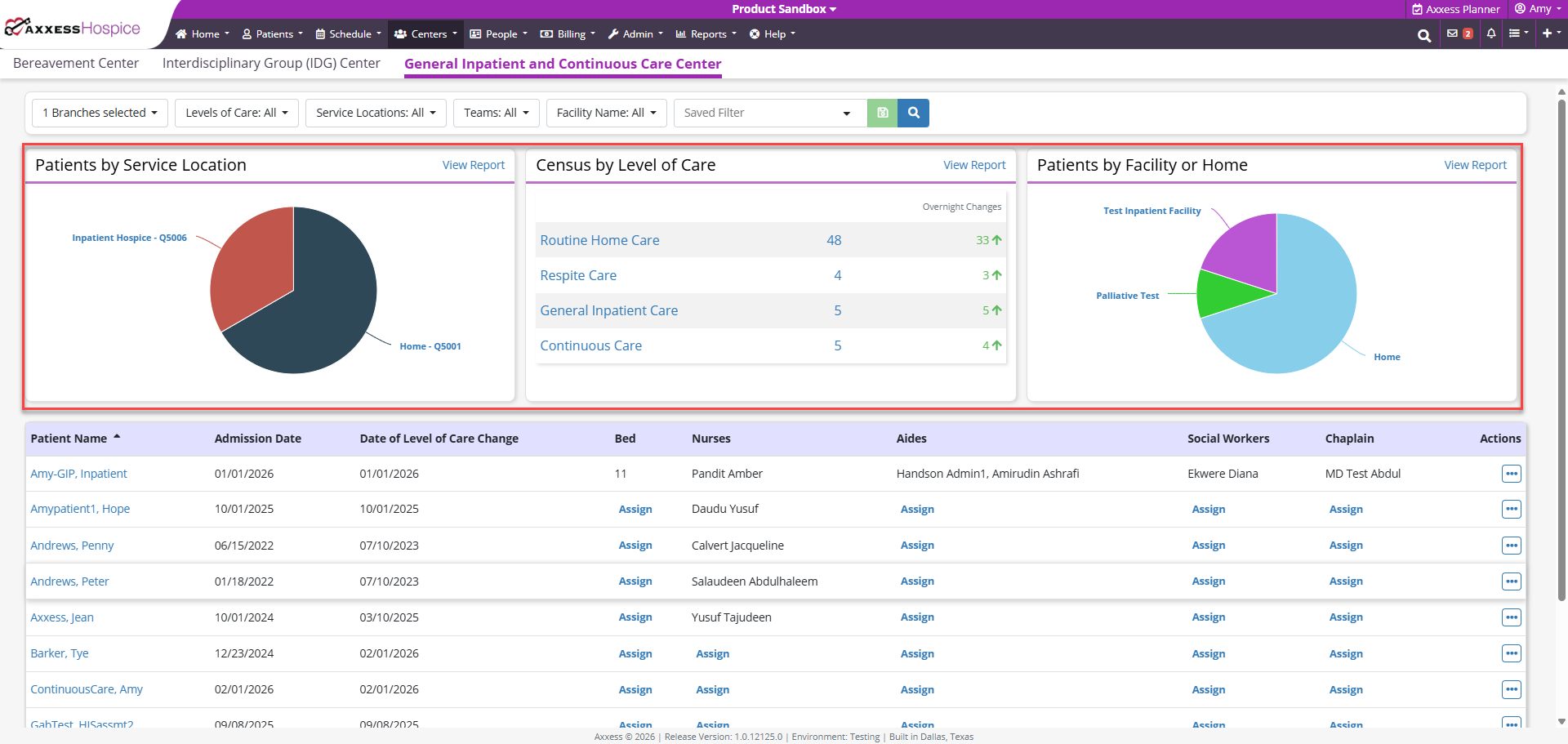 Axxess Hospice now provides a General Inpatient and Continuous Care Center under the Centers tab. This centralized view helps teams manage patients who require higher levels of care by bringing bed assignments, staff allocation, and care locations into one streamlined workspace.