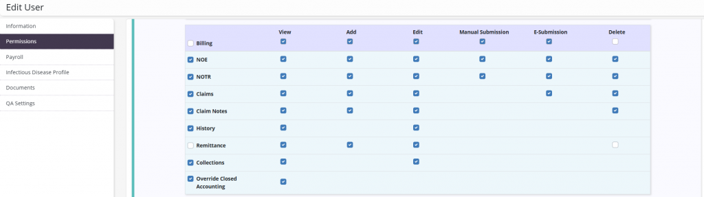 To give a user permission to manually submit NOEs or NOTRs, edit the user’s profile and navigate to the Permissions tab. In the Billing section, select Manual Submission next to the NOE and NOTR permissions. Click Save to finish granting the permissions to the user.