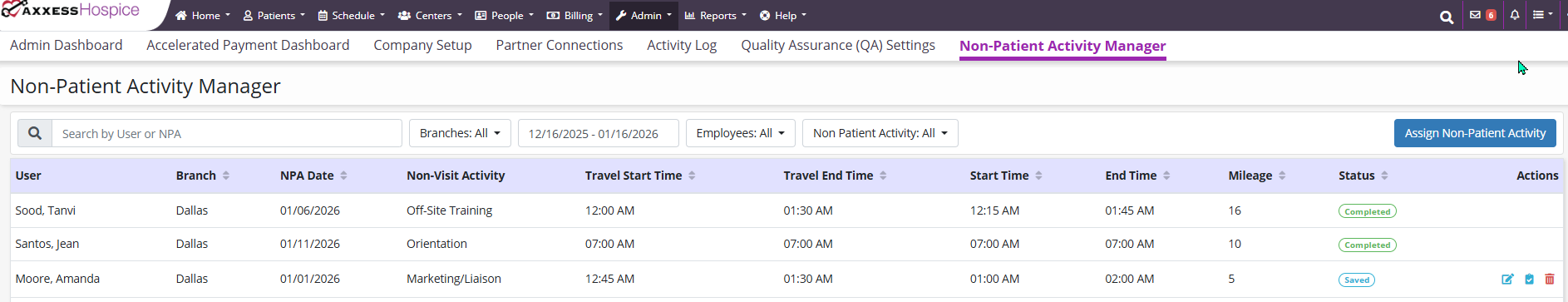 Axxess Hospice now enables users to assign non-patient activities in the Non-Patient Activity Manager. This enhancement streamlines operations by enabling users to assign and complete non-patient activities for employees.