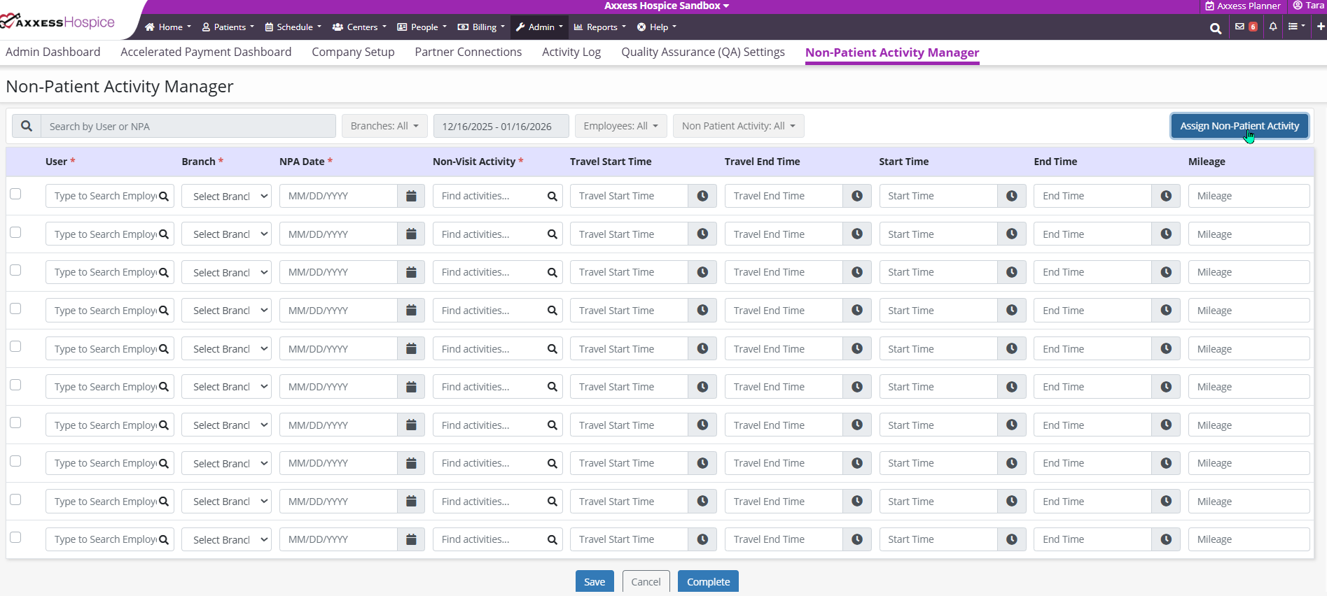 Select the Assign Non-Patient Activity button to assign a new activity. Once the information has been entered, select Complete.