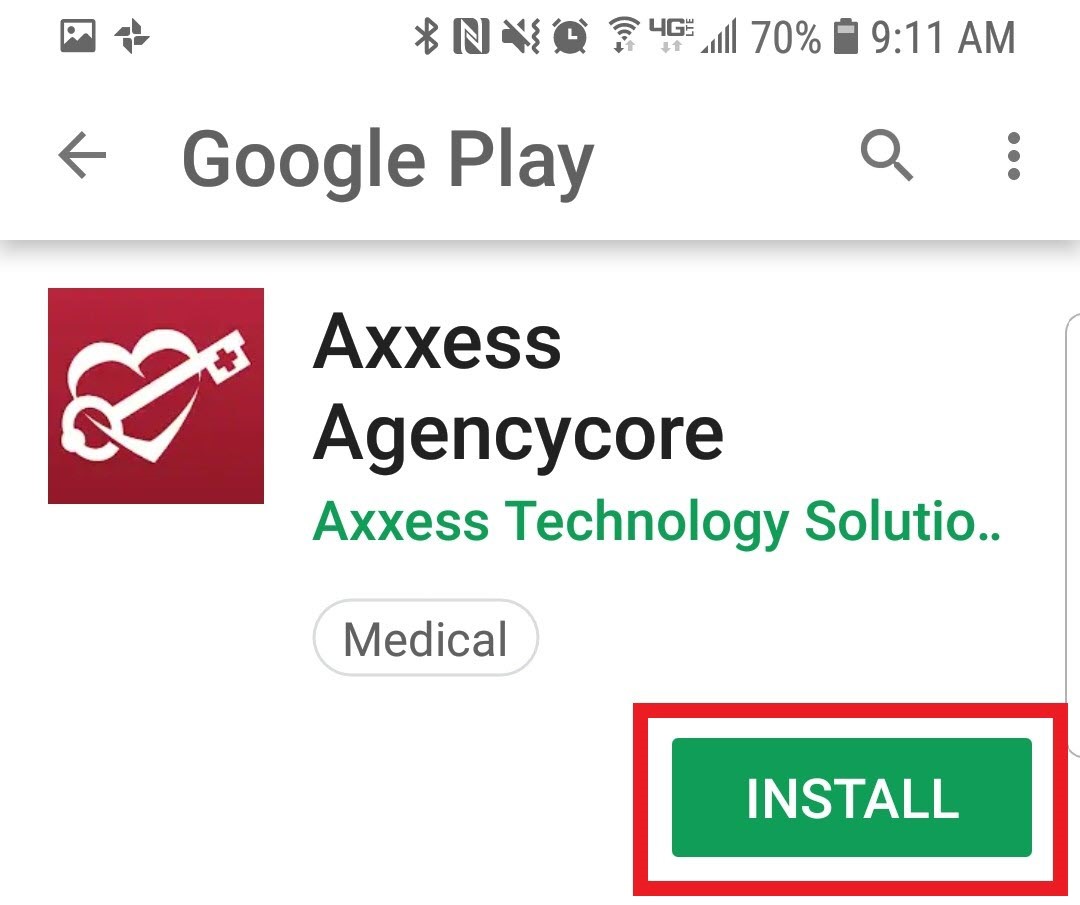 Search for "Axxess AgencyCore." The app is red and has the Axxess logo (heart & key). Tap on the result.