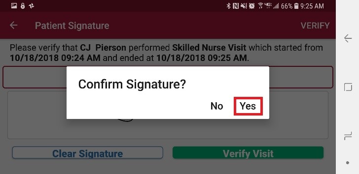 After tapping, the following window shows to Confirm Signature. Tap "Yes."