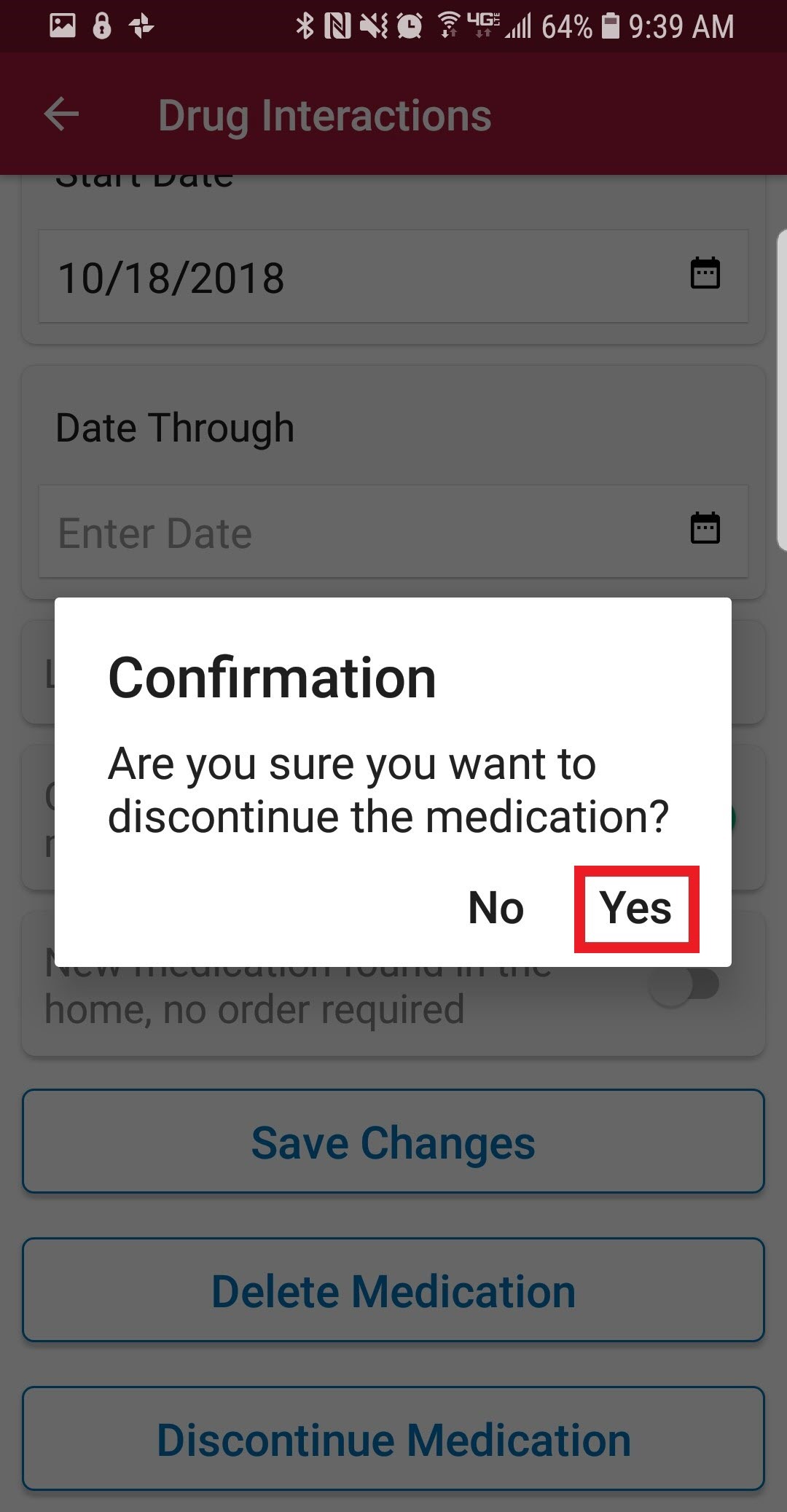 Once a medication has been entered, it can be edited it by tapping on the name of the medication. Scroll to the bottom of the page to "Delete Medication" (if added in error) or "Discontinue Medication" (patient no longer taking medication). After tapping Discontinue Medication, confirm by tapping "Yes."