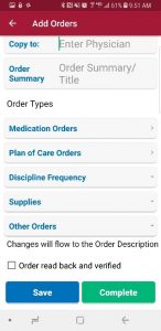 Then select which type of order it is. Select from Discipline Frequency, Supply Manager, Medication or Plan of Care Orders. If the order being entered does not fall under any of those four categories, type it in the Other Orders section. Signature Time automatically enters the time the new order is opened. Tap on "Save" to return to the order later. If the order is ready to be sent for physician signature, tap "Complete." It will then prompt for the Staff Signature.