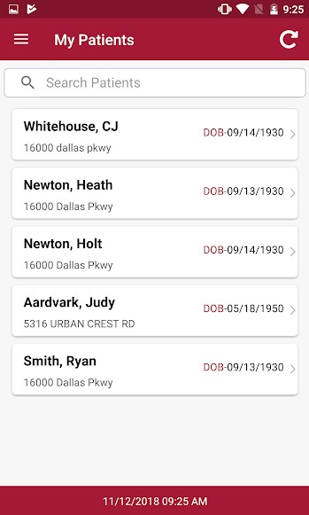 It will list the patient name in bold, address below and DOB to the right. To narrow the list, start typing the patient's first or last name in the Search bar at the top of the screen. Tap on the patient to open the Patient's Chart.